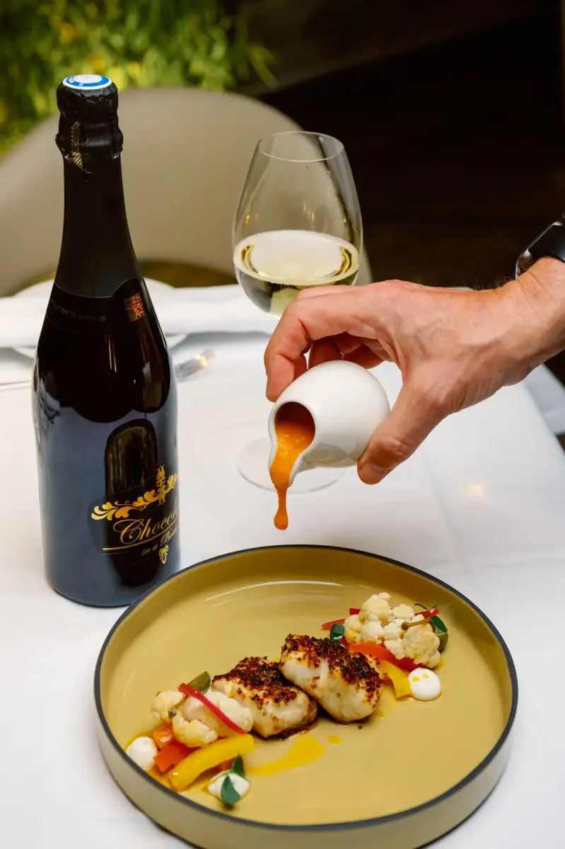 The elegant freshness of Blanc de Blancs, a sparkling wine made from Chardonnay grapes, harmonizes beautifully with the rich, intense flavors of Chocolate in a Bottle, an inventive blend of Belgian chocolate and wine.